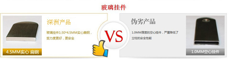 不銹鋼立柱配件玻璃掛件采用1:30*4.5MM實心扁鋼,讓受力度更好,更安全,玻璃掛件款式多種新穎,而常見的1.0MM厚度的空心掛件,嚴重降低了立柱的安全性能,不利于扶手玻璃的穩(wěn)定。