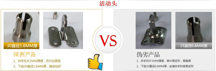而普通廠家的扶手托片是采用1.6mm厚的單片設計,這種設計容易變形,而且容易脫落,下座采用直徑26mm,0.6MM厚,安裝扶手時容易變形。
