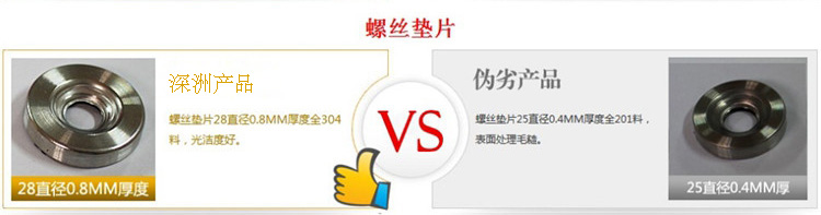 而劣質產品的螺絲墊片直徑是25mm,厚度0.4MM,采用201材質,表面處理毛糙。